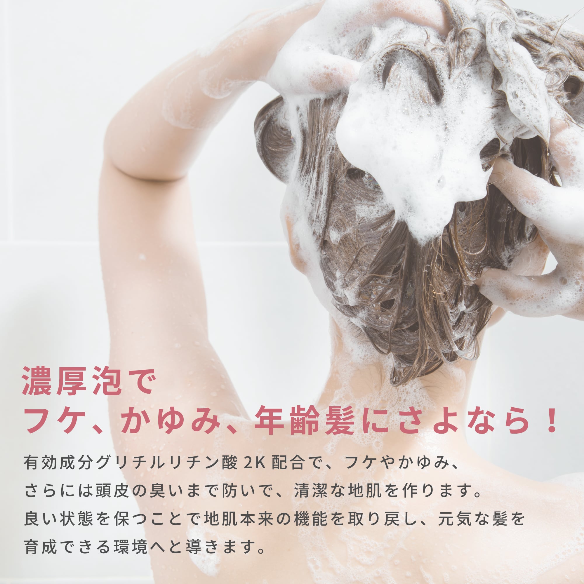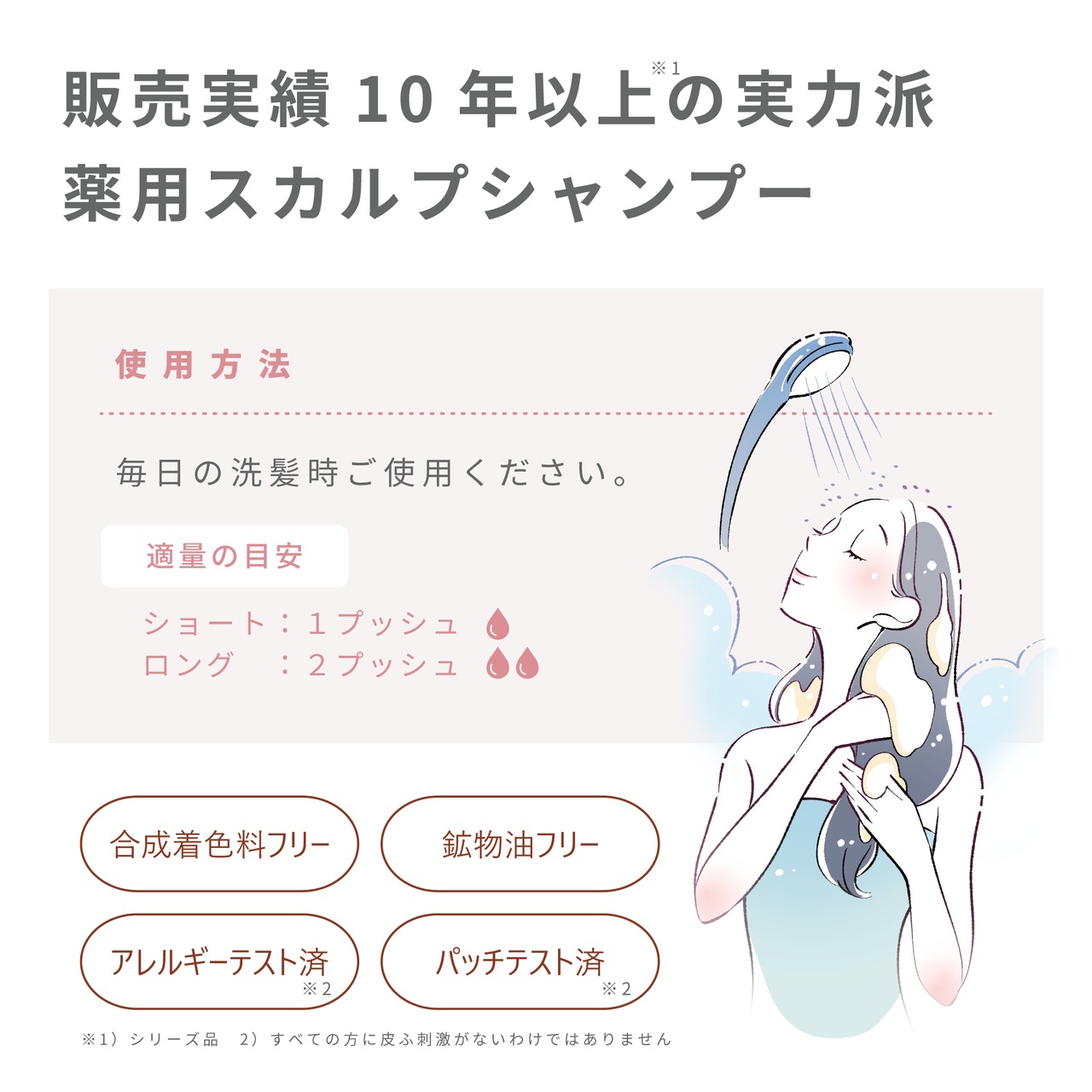 優れた保湿力を持つ、高純度美容保湿成分「リピジュア」と退色防止効果のある「セラキュート」を配合した薬用スカルプシャンプー。独自発送CR(キャッチ&リリース)ポリマーは、頭皮や髪へ保湿成分を届け、甘草由来成分で抗炎症作用のある「グリチルリチン酸2K」配合で、ふけ・痒み、さらには頭皮のニオイまで防いで、清潔な地肌を作ります。