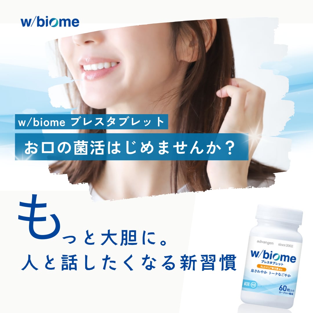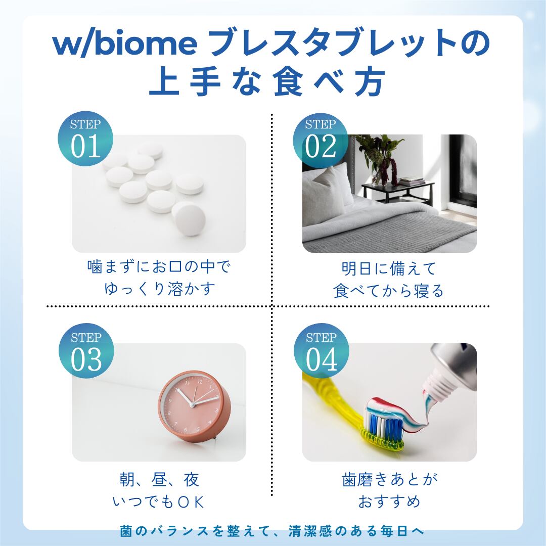 w/biome(ウィズビオーム)ブレスタブレットは、善玉菌をお口の中に補給し増やすことで、お口の健康を保つように設計されたサプリです