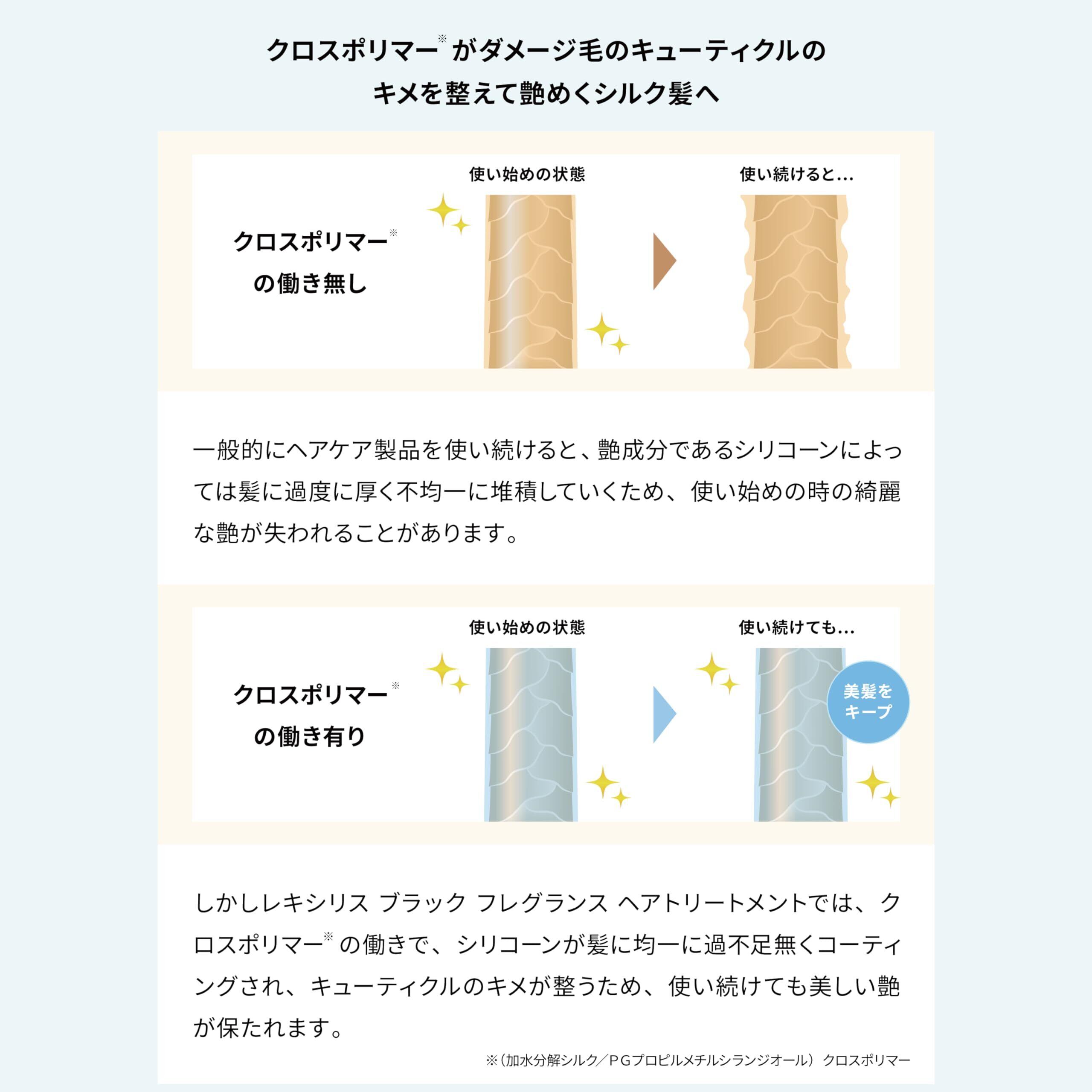 高純度美容保湿成分「リピジュア」はもちろん、3種のセラミドで髪を内側から補修し、クロスポリマーがダメージ毛のキューティクルのキメを整えて艶めくシルク髪へ。