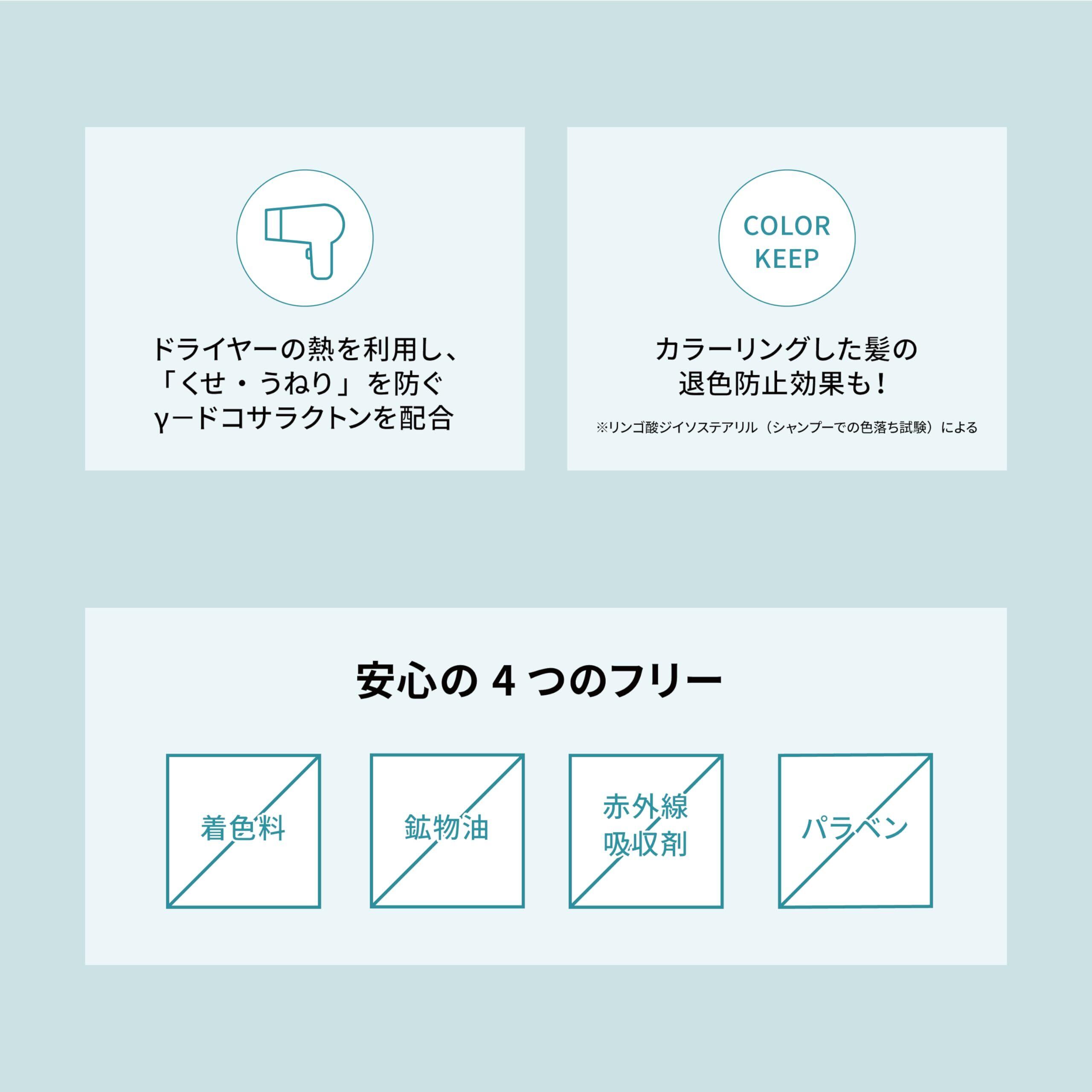 ドライヤーの熱を利用し、くせ・うねりを防ぐy-ドコサラクトンも配合。